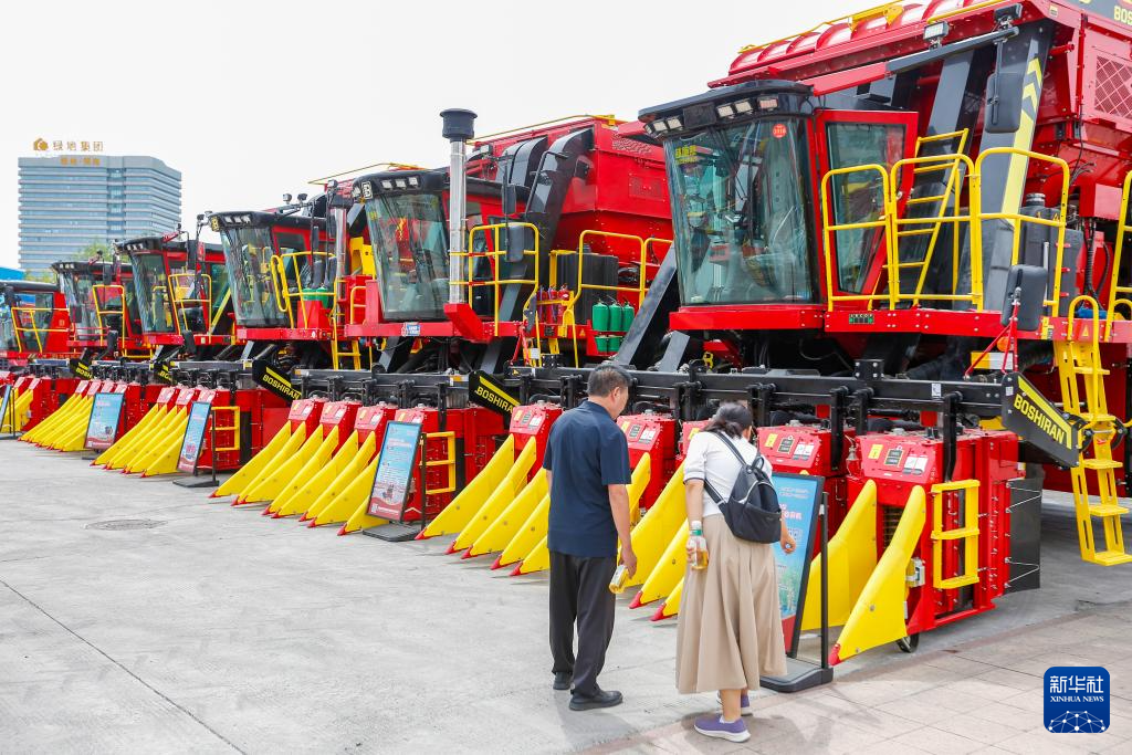 6月30日,在第八届中国——亚欧博览会上,观众在了解新疆钵施然智能农机股份有限公司制造的采棉机。