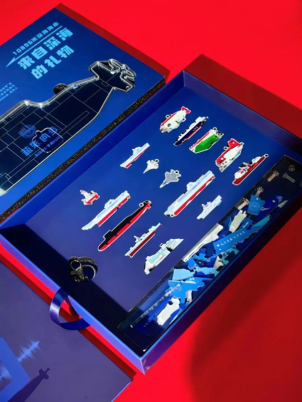除了“限量款”水滴外,学校还精心设计了专属潜艇造型的文创摆件,航母、LNG船、大型邮轮,造船工业皇冠上的“三颗明珠”悉数登场,“奋斗者号”“深海勇士号”“蛟龙号”载人潜水器,一枚枚精巧的“国之重器”拼图闪烁着哈工程校友和哈工程人的智慧,彰显了中国深潜硬核实力。