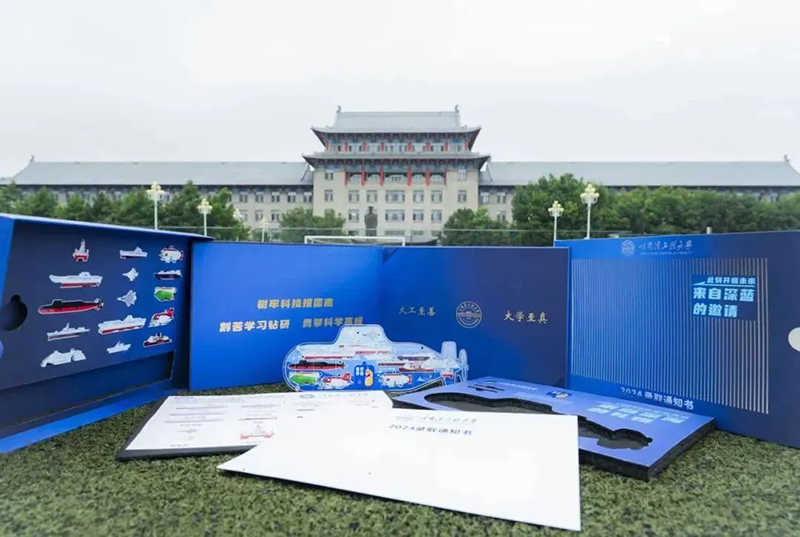 据“哈尔滨工程大学”官方微信公众号介绍,通知书以“来自深蓝的邀请”为主题,整体以深邃的船海蓝为背景,寓意哈工程青年学子以“为船、为海、为国防”的责任担当,承载着走向深蓝、实现海洋强国的使命;深蓝的色调、镂空的设计与排列整齐的栅格,尽显海的深邃与神秘,寓意星辰大海漫漫征途,未知的奥秘等待与你共同探寻;录取通知书卡册正面,以探幽深海的水下潜器为主体图案,背面是水下潜器光影效果图,寓意哈工程人致力于祖国船海事业,始终在向海图强的道路上砥砺前行,巨轮前行的朵朵浪花,抽象为浮动的波纹,记录着深海的声音,寓意哈工程人,在探索深海过程中技术上的不断求索。
