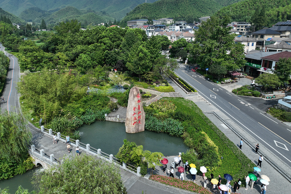 游客在浙江安吉余村的绿水青山间参观(2023年8月11日摄)。翁忻旸摄/本刊